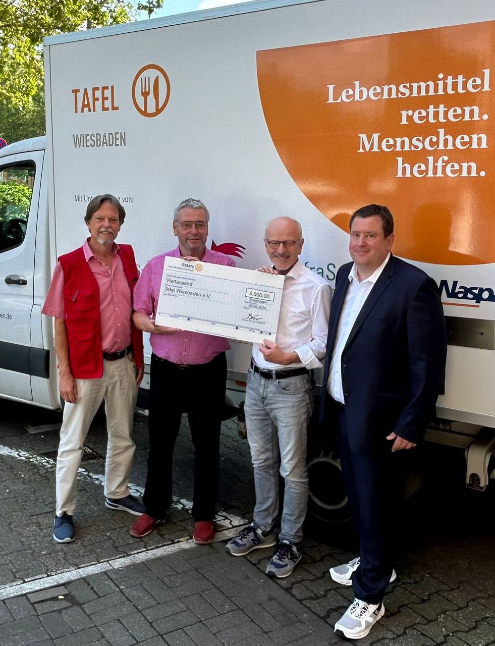 Am 02.08.2024 wurde ein Scheck in Höhe von 4.000 € durch Herrn Gleich sowie den Präsidenten des RC, Jörg Brömer, übergeben. Im Namen der Tafel Wiesbaden bedankten sich Klaus Lanzendörfer und Gerhard Schlemmer herzlich für die Unterstützung.