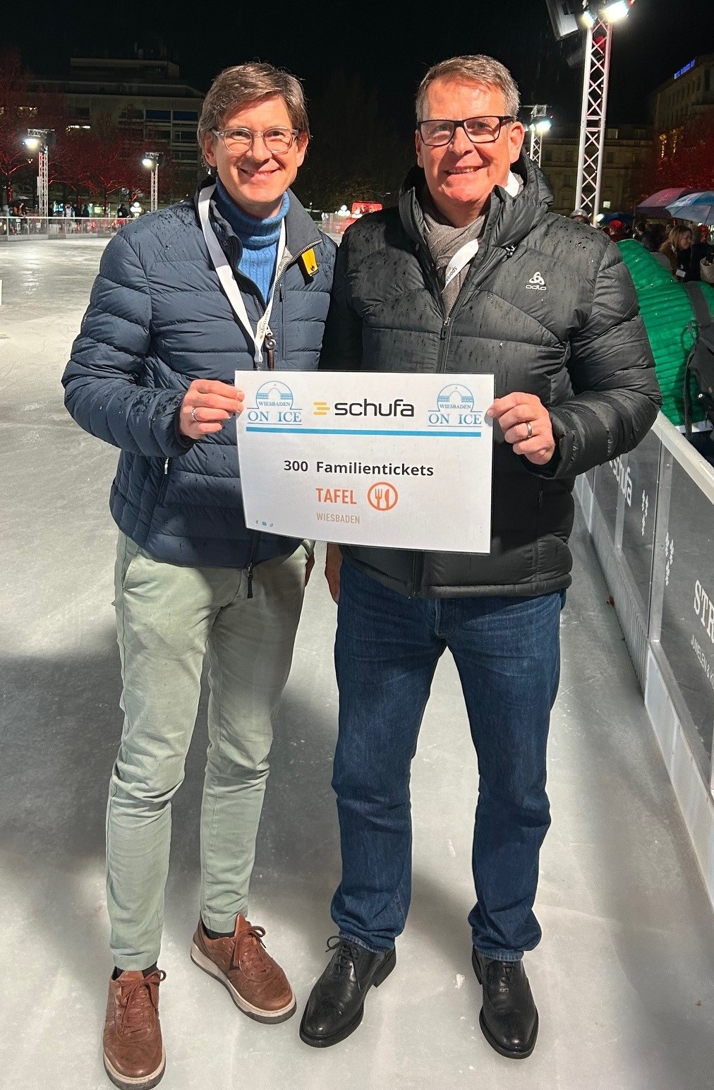 Der Vorstandsvorsitzende der Schufa Holding AG, Ole Schröder (links auf dem Foto) überreicht dem 1. Vorsitzenden der Tafel Wiesbaden, Thomas Fuhrmann, 300 Familientickets für die Eisbahn vor dem Kurhaus. Jedes Familienticket gilt für 3 Personen. Wir freuen uns, diese an unsere Kunden weitergeben zu können und sagen: DANKE!
