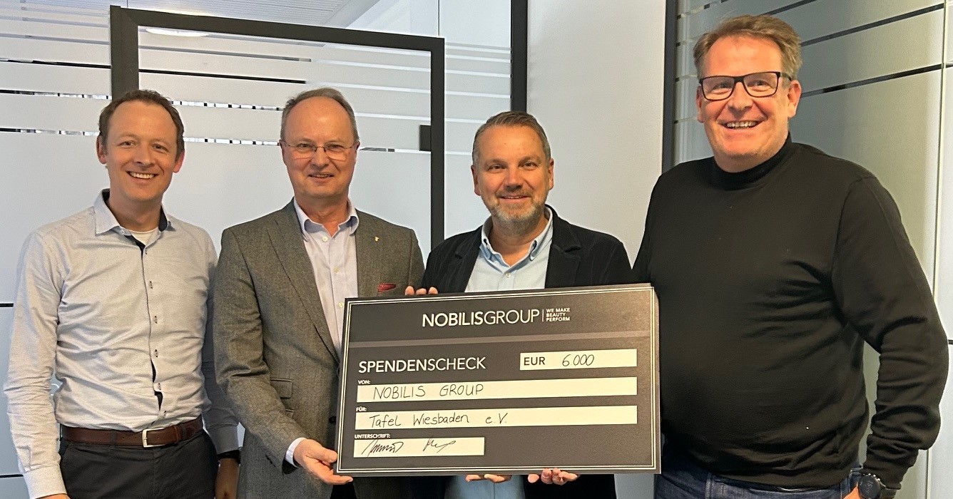 Der CEO der Nobilis Gruppe, Udo Heuser (2.v.re), und der Finanzvorstand Matthias Mennekes (li.) setzen durch ihre erneute Spende die Unterstützung der Nobilis Gruppe für die Tafel Wiesbaden fort.